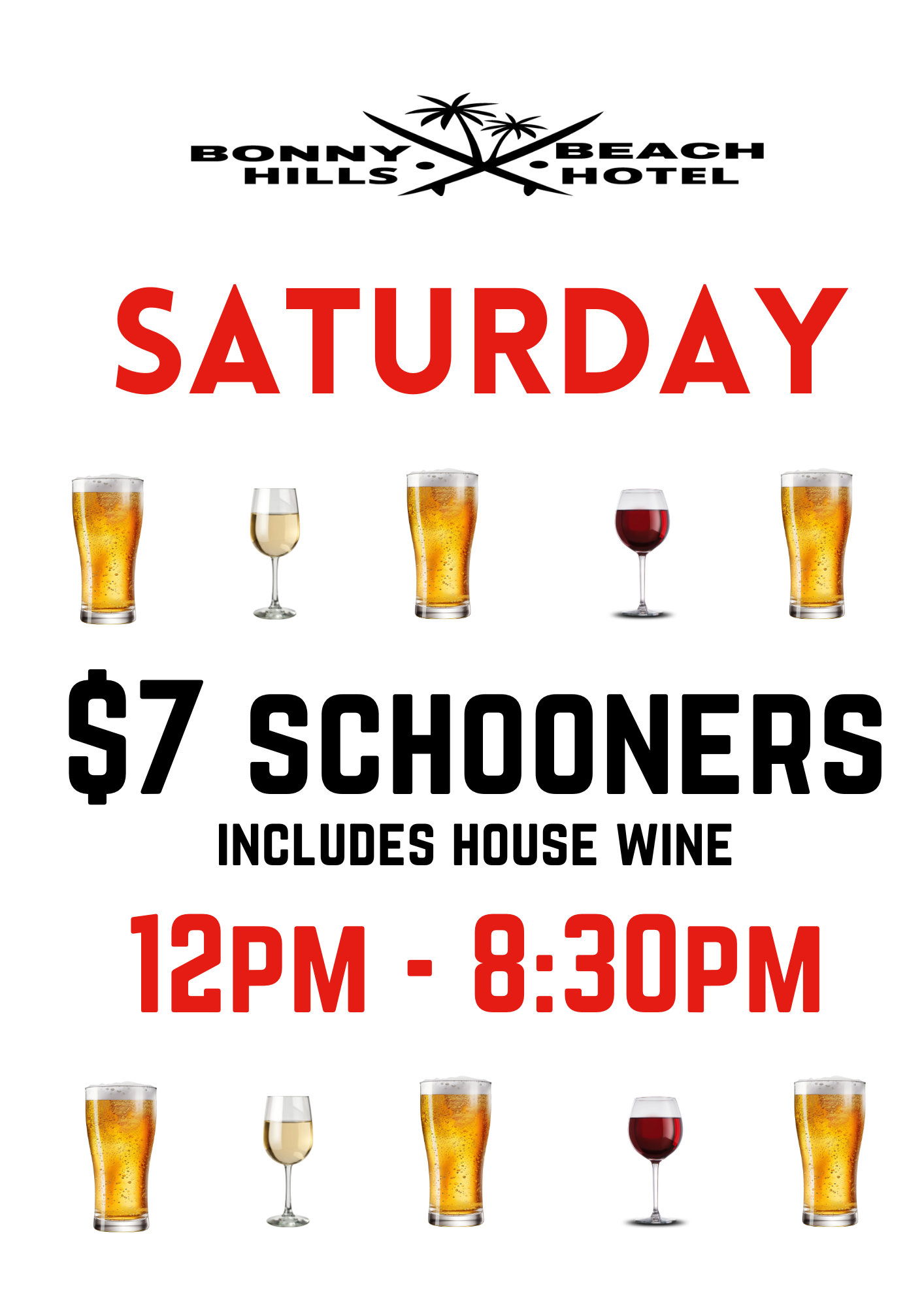 This Saturday, come and enjoy a a Schooner of Beer or a House Wine for $7 between Midday & 8:30pm!